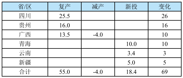 2025年复产产能55万吨/年,主要分布在四川、贵州和广西等省/区,复产产能大部分来自2024年底由于经营压力过大而关停的企业,还有一部分来自于技改后投放的项目。