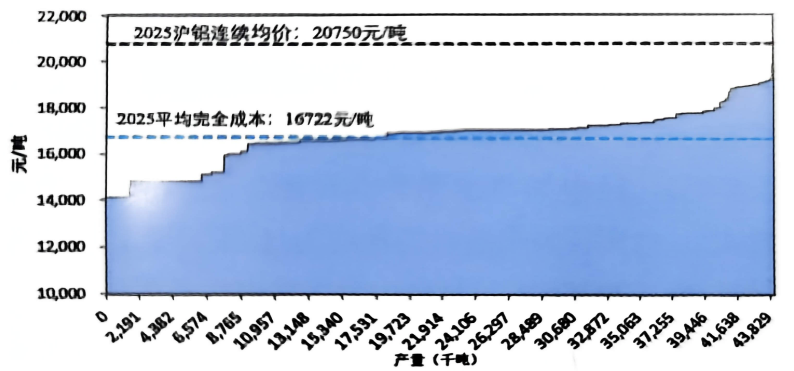 根据安泰科测算,2025年中国电解铝加权平均完全成本(含税)为16722元/吨,较上年下降5.6%或995元/吨;全年吨铝平均利润约为4028元(由于各地区企业所得税税率不同,故没有剔除增值税和所得税),创历史新高,较上年增加80.8%或1801元。