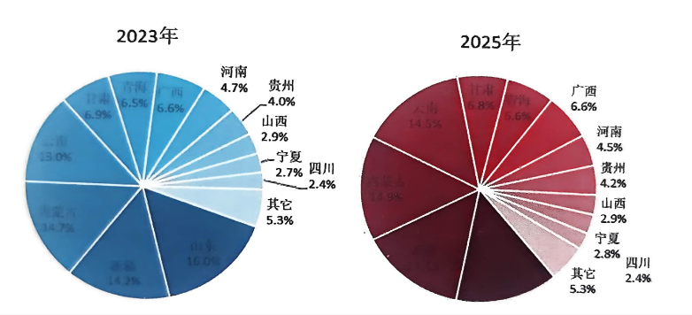 2025年产能置换加快推进,电解铝产能布局进一步调整,同时随着技改项目的落地,600kA槽型占比正在快速提升。产能置换主要分为三类:一是山东产能持续向云南转移;二是河南等地企业加速向新疆、内蒙古转移;三是青海桥头、青海百合、青铜峡铝业、霍煤鸿骏等企业,均启动600kA产能置换及转型升级技改。寻求低电价和新能源是近两年企业进行产能转移的首要考虑因素,以新疆为代表的地区成为重要选址之一。2025年,伊电集团、万基集团先后公布了向内蒙古、新疆进行转移的产能置换公告,这是近两年以来最大规模的异地转移,备受行业关注。与此同时,山东电解铝产能持续向云南转移,两省产能呈现此消彼长的发展态势,这一特征愈发显著。