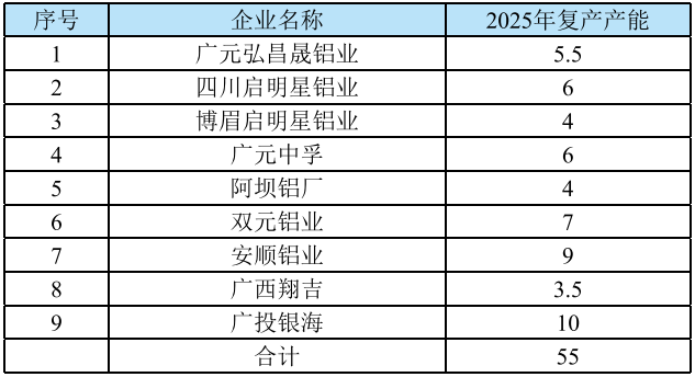表1-2 2025年中国电解铝复产产能变动情况(万吨/年)