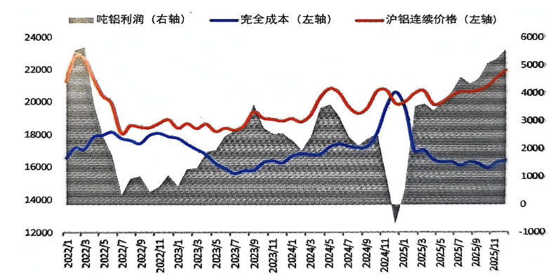 2025年,氧化铝、电力等原材料及能源价格下跌带动电解铝成本下降,同时受海外供应扰动、需求预期增长以及美联储降息等多重因素影响,电解铝价格继续上行,全行业保持较高盈利水平。尤其四季度,随着价格重心显著抬升,吨铝利润飙升至5000元以上。