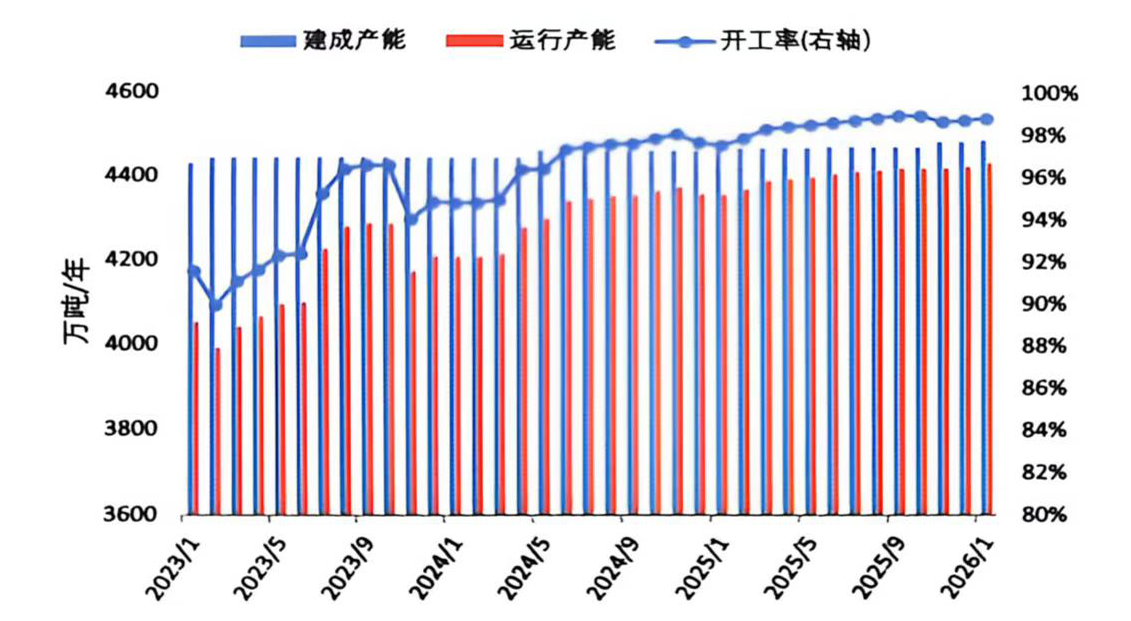 2026年1月,国内电解铝建成产能与运行产能均维持高位运行。截至1月底,建成产能4488万吨/年,运行产能4434万吨/年,环比增加9万吨/年,整体产能规模保持稳定,运行产能小幅提升。2026年年初,电投能源旗下扎哈淖尔电解铝二期项目35万吨/年进入试生产阶段,待项目全面投产后,该公司电解铝总产能将达到161万吨;1月上旬,包铝电解一厂完成1182号电解槽启动,全系列1166台电解槽全部运行,生产线实现满负荷生产;同期,天山铝业140万吨电解铝绿色低碳能效提升改造项目产能逐步释放。当前国内产能已接近“天花板”,行业开工率维持在98%以上,后续产量释放与产能扩张均已逼近极限。